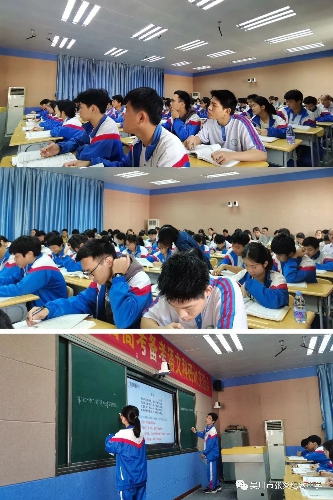 吴川市教师发展中心主任容伟文、李志丰,兼职教研员刘小梅老师以及兄弟学校的各位领导老师,我校陈亚润校长、林天乐副校长、陈华平副校长、教导处主任张亮、高三级级长林海生、教学级长林聪以及高中语文科全体老师参加本次活动。